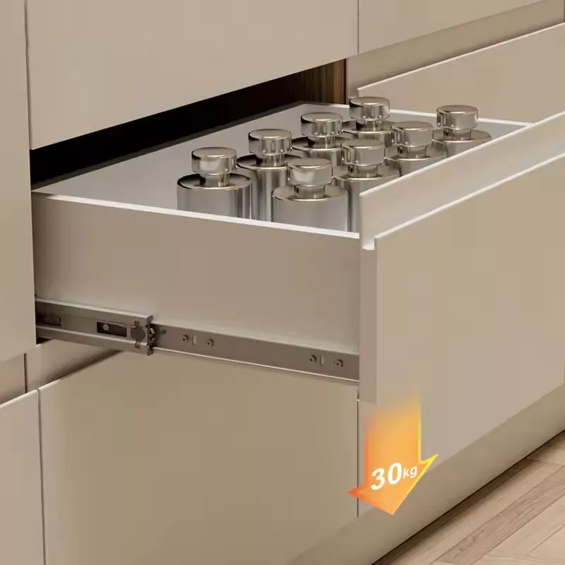 Ensimmäinen asia, joka on otettava huomioon, on materiaalivalinta. Laatikkojuoksijoita on kahta yleistä tyyppiä: kuulalaakeri ja hihnapyörä. Kuulalaakerityypit liukuvat sujuvammin, kun taas hihnapyörätyypit ovat edullisempia. Keittiöt ja kylpyhuoneet ovat usein kosteita ympäristöjä, ja huonolaatuiset liukukiskot ovat alttiita ruostumiselle. Tämä lisää kitkaa, aiheuttaen vakavaa tukkeutumista vedettäessä laatikoita tai kaapin ovia. Ajan myötä tämä voi aiheuttaa vaurioita ja vähentää merkittävästi huonekalujen elinikäistä. Siksi pehmeät läheiset laatikon liukumäet vaativat tiettyä korroosionkestävyyttä sopeutuakseen tällaisiin kosteisiin ympäristöihin. Tyypillisesti käytetään alumiiniseosta, galvanoitua terästä tai ruostumattomasta teräksestä. HY lähtee kaikki sen materiaalit tunnetuilta kotimaisilta valmistajilta, mikä varmistaa vakaan laadun ja suorituskyvyn.